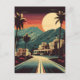 L'image représente une illustration stylisée d'une vue hollywoodienne pittoresque. La palette de couleurs est chaleureuse avec une ambiance rétro, avec des tons orange, rouge, jaune et turquoise. Au premier plan, il y a une route qui mène vers l'horizon, marquée de lignes blanches qui suggèrent un flou de mouvement, donnant un sens de profondeur et de mouvement. À côté de la route se trouvent des palmiers, symboles emblématiques d'un climat chaud et souvent associés à des destinations de vacances. Au milieu se trouvent deux bâtiments à l'architecture rappelant les styles espagnol ou méditerranéen, tels que les toits en terre cuite, les arches et les murs en stuc. Dans l'arrière - plan, il y a des montagnes ondulées sous un ciel sombre, avec le soleil suspendu bas et large, jetant une lumière douce sur la scène. L'atmosphère générale de l'image est celle d'une escapade tranquille et exotique au coucher du soleil. Les oeuvres d'art peuvent être associées au voyage, aux loisirs ou à l'attrait du paradis.