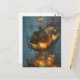 La carte postale Imaginaire art offre une vue aérienne d'une ville futuriste en apparence flottante, Steampunk, avec des fenêtres lumineuses en ambre à l'intérieur de bâtiments de plusieurs étages.