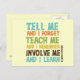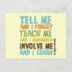 Benjamin Franklin cite : "Dis-moi et j'oublie. Apprends-moi et je me souviens. Impliquez-moi et j'apprends." ! Ce message inspirant est disponible en texte multicolore sur T-shirts, sweat - shirts à capuche, sacs fourre-tout, magnets, tasses, porte - clés, boutons, bouteilles d'eau et bien d'autres choses qui conviennent à tous ceux qui aiment l'éducation !