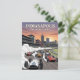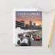 Une illustration éclatante de voitures IndyCars qui courent sur une piste avec l'horizon d'Indianapolis dans l'arrière - plan au coucher du soleil.