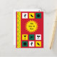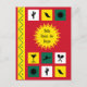 La conception de cette carte est inspirée par les joies du Mexique. Les couleurs sont le vert, le rouge et le blanc pour le drapeau mexicain, avec en plus un jaune ensoleillé brillant. "Feliz Cinco de Mayo" = "Joyeux cinq mai". Le fond est rouge, avec un soleil rayonnant au milieu et une bande à motif en zig-zag sur le côté gauche. Le motif de neuf carrés colorés contient des icônes sur le thème du Mexique en silhouette : cactus, piment, soleil, verre à cocktail, sombrero et maracas.