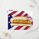 L'Amérique écrite avec de la moutarde sur hot dog en brioche sur la plaque du drapeau pour la fête de vacances