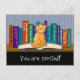 Customisez le texte sur cette carte postale pour votre parti. Il est idéal pour une fête d'anniversaire pour quelqu'un qui est un ver de livres et aime les chats, ou pour un événement de bibliothèque ou de librairie, etc. Ce chat adore les livres autant que vous — et est aussi une bonne compagnie !