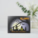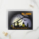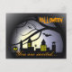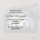 Invitation de la fête des adultes d'Halloween. Il présente un sombre paysage urbain de bâtiments à la lumière jaune derrière les fenêtres, un chat noir, des chauves-souris et un crâne devant une immense lune grise.