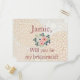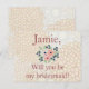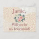 Demandez à vos amis d'être votre demoiselle d'honneur en utilisant cette belle carte postale. "Floral Bridesmaid invitation" présente un bel arrière - plan floral chic aux fleurs beiges. Le texte est écrit en bordeaux. Le nom est écrit en imprimé, avec un bouquet de fleurs vert, bleu et pêche en dessous. "Serez-vous ma demoiselle d'honneur est écrite en bas. Arrêtez-vous et faites vos courses aujourd'hui ! Conception de l'invitation : WeddingsbyRhoadie Papier floral arrière - plan : Prettygrafik design (https://www.etsy.com/shop/Prettygrafikdesign) Clipart florale : AMBillustrations http://www.etsy.com/shop/AMBillustrations/