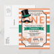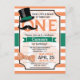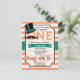 Moustache rétro amusante, chapeau vintage, et arc cravate garçon premier, 1er, invitation de fête d'anniversaire sur orange et blanc motif. Les couleurs sont le vert, l'orange et le blanc. Personnalisé pour votre enfant, celui de votre enfant, celui de votre enfant, celui de votre enfant, celui de votre enfant, celui de votre enfant, celui de votre bébé. Première invitation d'anniversaire pour garçon.