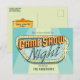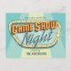 Carte postale d'invitation pour une soirée de jeux télévisés avec un panneau typographique "Game Show Night". Ces conceptions comprennent des éléments de bleu, de jaune, de rouge et d'orange, un podium de jeu télévisé, un panneau lumineux et des éléments inspirés des jeux télévisés rétro. Les produits comprennent un modèle pour une personnalisation personnelle.