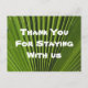 Rendez le séjour de vos invités inoubliable et démarquez votre location de vacances de la concurrence avec cette carte postale peu coûteuse. Cette carte promotionnelle présente une photo de la nature qui capture une feuille de palmier verte brillante affichant les rainures profondes et ombragées de cette plante tropicale. "Merci de votre séjour avec nous" peut être rapidement personnalisé si vous le souhaitez.
