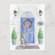 Annoncez votre nouvelle adresse avec notre faire-part élégante avec un Wolf Hound irlandais, une porte d'entrée bleue, un tapis de bienvenue, une ardoise, des topiaires et une couronne fleurie posée sur un arrière - plan en brique grise.