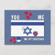 Jolie carte de la Saint-Valentin Israël Tu B'Av NOUS ALLONS BIEN ENSEMBLE pour les couples, pour les hommes et les femmes pour célébrer les vacances de l'amour d'Israël ou la Saint-Valentin et les anniversaires. Le design montre des pièces de puzzle dans le contour du drapeau israélien en forme d'ÉTOILE DE DAVID sur un fond bleu pâle. Le message indique "VOUS, MOI, NOUS ALLONS BIEN ENSEMBLE" avec de petits cœurs rouges. Tout le texte est PERSONNALISABLE afin que vous puissiez remplacer VOUS et MOI par vos initiales et / ou vos noms et ajouter votre date spéciale. Cela ferait une excellente carte pour célébrer la Saint-Valentin ט״ו באב d'Israël. Cadeaux assortis disponibles.