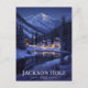 Capture the cozy serenity of Jackson Hole, Wyoming, USA, with this breathtaking vintage-style postcard featuring a winter night scene. The design showcases a small village of illuminated log cabins nestled beside a reflective river, surrounded by snow-covered pine trees and dramatic, moonlit mountains. This travel poster is perfect for skiers, winter sports enthusiasts, nature lovers, and anyone who appreciates rustic mountain scenery. Ideal for sending holiday greetings, keeping as a cozy souvenir, or framing as rustic lodge decor.