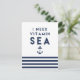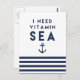 Quand vous avez besoin d'une dose de ce que seul l'océan peut fournir...il vous faut de la vitamine Mer ! Notre carte postale, chic nautique et estivale, présente la citation "I Need Vitamin Sea" en lettres bleues de marine avec une illustration d'ancre et une bande de rayures marines et blanches le long du fond.
