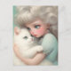 "Jamais sans toi" Une carte postale sucrée d'un amoureux des chats, serrant son chat en peluche blanc avec beaucoup de tendresse. Les couleurs sont pastel. Cette oeuvre représente un très beau moment d'amour.