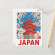 Celebrate the serene elegance of Japan with this vibrant travel postcard. The design features a striking red five-story pagoda framed dramatically by blooming white cherry blossoms (Sakura) against a bright blue sky. This artwork captures the classic beauty of Japanese spring and traditional architecture, making it an excellent souvenir or art piece for cultural enthusiasts and collectors of stylized Asian travel posters.