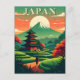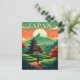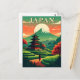 Une carte postale japonaise de style rétro époustouflante avec une pagode traditionnelle, des terrasses verdoyantes et l'emblématique Mont Fuji au coucher du soleil. Parfait pour les collectionneurs, les voyageurs et les amateurs de culture japonaise.