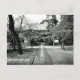 Photo en noir et blanc d'arbres et chemin dans un jardin de temple japonais.