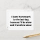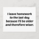 Je laisse mes devoirs à la Dernière journée parce que je serai plus vieux et donc plus sage.