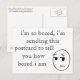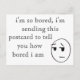 Ennuyeux ? Besoin de l'annoncer à vos amis et à votre famille ? Alors cette carte postale est juste pour vous ! La carte postale dit : "Je m'ennuie tellement, j'envoie cette carte postale pour vous dire à quel point je m'ennuie" Oui, maintenant vous pouvez vraiment annoncer votre ennui! Inspiré par un ami : -) Design original de Sunny. Copyright 2013