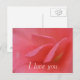 Carte postale 'Je t'aime' avec des pétales de rose rose. Simple et direct ; faites-leur savoir ce que vous ressentez. Parfait pour la Saint-Valentin