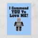 Qui pourrait résister à cet adorable robot ? Cette drôle de conception de robot geek comporte le message hilarant "Je vous commande de m'aimer !" avec un robot geek mignon et exigeant avec un coeur d'argent ! Ce robot humour design est le cadeau idéal à acheter pour votre grand ami le jour de la Saint-Valentin ou toute autre occasion romantique.