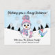 Joli bonhomme de neige rose et bleu dessiné à la main avec casquette d'hiver de vacances mignon et adorable oiseau bleu mangeant semence d'oiseau et flocons de neige arrière - plan. Carte postale de Noël personnalisée