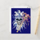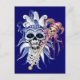 Le crâne Jester de style Mardi Gras porte un masque de style Nouvelle-Orléans dans les tons bleu et blanc argenté et tient un crâne doré Jester scepter.