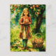 Carte postale en aquarelle portrait d'une jeune fille en robe rouge debout dans un verger, tenant un panier de pommes. Elle est entourée de pommes mûres sur le sol et accrochées aux arbres. La scène évoque la chaleur, l'innocence et la beauté de la nature.