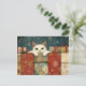 Cette illustration d'un joli chat blanc se penchant sur des cadeaux de Noël est imprimée sur une carte postale. Graphisme assisté par IA acheté avec utilisation commerciale. Œuvre d'art : DelightfulDigiArt