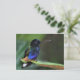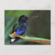 Joli colibri noir, bleu et vert. Ce petit oiseau est assis sur une feuille avec une plume dans son bec.