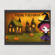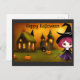Souhaitez à tous une joyeuse Halloween avec cette carte postale mignonne avec une sorcière anime et une maison hantée et design citrouille!