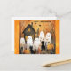 Souhaitez à tous une joyeuse Halloween avec cette carte postale avec un mignon fantôme, chat noir, citrouille et design de maison hanté!