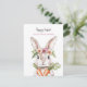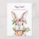Carte postale avec un joli lapin de Pâques avec des carottes. Magnifiques couleurs printanières en tons pastel rose, orange et brun, design floral aquarelle, et un lapin super mignon tenant deux carottes oranges. Texte personnalisé avec une écriture tendance charmante.