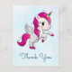 Carte de remerciement avec une licorne ailée blanche avec crinière rose, queue et sabots. La corne a des anneaux de couleur arc-en-ciel et ressemble à une sucette en bonbon. Cette licorne mignonne se cabre sur ses pattes arrière. Joli cœur rose sur sa joue.