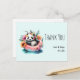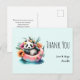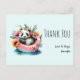 Carte postale de remerciement avec une image estivale adorable. Un design à l'aquarelle avec un panda noir et blanc assis dans un cercle de natation dans l'eau. Entouré de jolies fleurs sauvages. Un ours totalement décontracté.