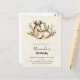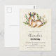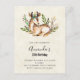 Invitation de carte postale d'anniversaire avec un joli cerf couché entouré de flore feuillue. Conception de style boho rustique.
