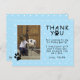 Carte postale de remerciement d'anniversaire avec empreinte de patte pour enfants. Jolie carte de remerciement d'anniversaire avec empreintes de pattes, note de remerciement, modèle de photo et nom de l'enfant. Le fond est bleu avec un motif à pois blancs. Insérez votre photo dans le modèle et personnalisez-la avec votre nom. Modifiez ou laissez le message de remerciement.