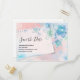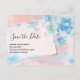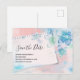 Carte postale d'invitation à retenir la date avec de belles fleurs bleues sur fond rose. Une image d'une page de cahier rectangulaire superposée pour que vous puissiez écrire votre texte à l'intérieur.