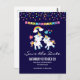 Carton d'invitation de fête avec 2 licornes dansantes mignonnes avec des queues et une crinière brillantes et colorées. Un arc-en-ciel coloré avec des nuages de chaque côté au-dessus de leurs têtes. D'autres éléments incluent une petite fleur, un cœur et quelques étoiles. Fond violet foncé. Points de confettis colorés et une image de banderole triangulaire le long du haut.