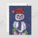 Cette carte postale est bleu foncé avec un bonhomme de neige joyeux portant un casquette et une écharpe tenant un chapelet de lumières de Noël brillantes dans la neige tombante.