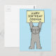 Un grand chat en caricature gris brandissant une pancarte couleur citron qui dit "Joyeux Josué d'anniversaire". L'image a un arrière - plan bleu pâle.