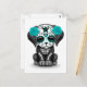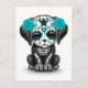 Ce joli design est orné d'un petit chiot noir décoré avec le Jour des motifs morts. Des roses bleus turquoises apparaissent dans les oreilles des chiens tandis qu'une étoile à cinq points est assise au milieu du front. Le visage du chiot noir est peint en blanc et décoré de tourbillons et de motifs de points dans la tradition du Jour des crânes de sucre morts. Des os blancs et une cage thoracique apparaissent sur le corps du chien, ce qui lui donne un aspect squelette. La tête surdimensionnée et le petit corps ainsi que les détails de la fourrure créent une belle combinaison d'un dessin animé et d'un look réaliste. Ce chiot unique et adorable est un adorable design Day of the Dead.