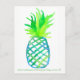 Une carte postale en l'honneur de la Journée internationale de l'ananas le 27 juin avec un ananas stylisé peint à l'aquarelle dans plusieurs tons de vert et de bleu vif avec un motif en treillis.