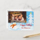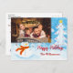 Personnalisez l'avant et l'arrière de cette carte postale de Noël amusante. Ajoutez votre photo et votre texte à cette carte colorée de Noël d'un bonhomme de neige parmi les arbres de Noël enneigés dans un ciel bleu clair. Vous pouvez personnaliser l'accueil de vacances en arrière, votre adresse de retour et vos noms en script près du bas avec de l'espace pour ajouter une note personnelle manuscrite.