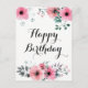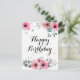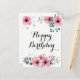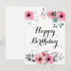 Joyeux Anniversaire dans une élégante police calligraphique entouré d'un magnifique motif floral aquarelle rose et gris .