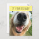 Envoyez des vœux d'anniversaire spéciaux avec cette carte postale adorable ! Le design présente une photographie d'un chien retriever doré heureux avec un grand sourire enjoué sur son visage. Le texte personnalisable indique "C'est ton anniversaire !" et "Fêtons cela."