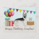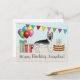 L'illustration originale de dessin animé de Destei d'un chien de race Berger Allemand de couleur silver sable / noir et argent. Le chien est placé dans un cadre d'anniversaire coloré. Il y a un gâteau d'anniversaire avec quelques bougies dessus, des ballons d'anniversaire colorés et une banderole ainsi que deux boîtes de cadeaux. Il y a également une zone de texte personnalisable.