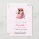 Carte d'invitation d'anniversaire avec une image adorable d'une chouette assise dans une tasse à café.