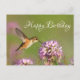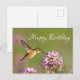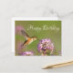 Cette superbe carte postale de colibri présente une belle photo d'un colibri roux sirotant le nectar d'une fleur d'abeille de montagne rocheuse avec le message "Joyeux Anniversaire". Photographie créée par la photographe primée Maria Jeffs.