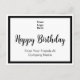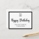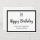 Vous pouvez ajouter votre logo au recto de cette carte postale. Le logo sera au-dessus d'un script qui dit Joyeux Anniversaire. Deux lignes de texte sont en dessous du script pour votre message personnalisé. La carte postale a une bordure noire.