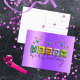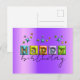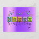 Conception unique de carte postale d'anniversaire personnalisée avec le texte JOYEUX écrit dans une typographie 3D gonflée associée à un script manuscrit entièrement personnalisable et à des scintillements de couleurs assorties sur un fond métallisé violet.
